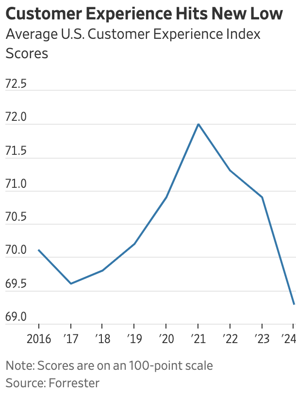 As the Wall Street Journal highlighted this month (June, 2024), customer satisfaction in the U.S. is at an all-time low. |